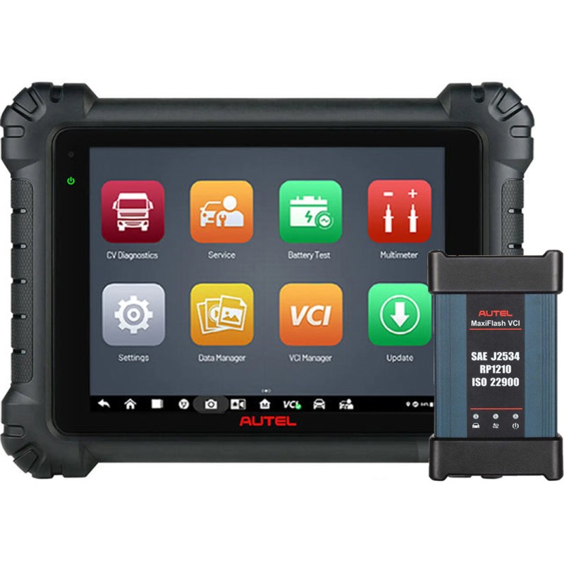 Autel MaxiSYS MS909CV est une tablette de diagnostic avancée pour véhicules utilitaires compatible avec plus de 80 modèles de véhicules légers, moyens et lourds. La tablette à écran tactile sans fil Android de 9,7 pouces effectue des diagnostics approfondis, notamment la possibilité de lire/effacer des codes, d’afficher des données en direct et d’effectuer des tests actifs.